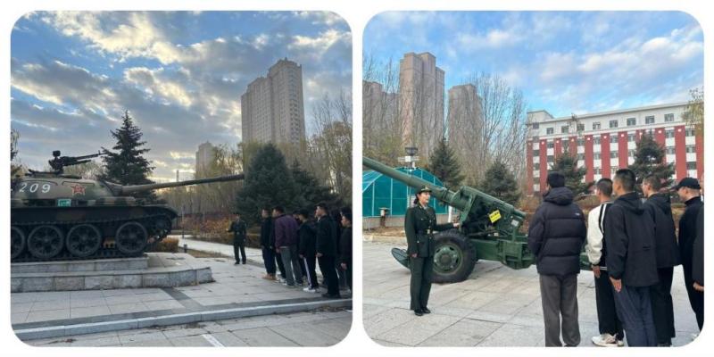 学长教官财管232班郭伟博、护理学232班董春婷带领学生参观了学校国防教育基地中的武器装备,为学生讲解榴弹炮、坦克等武器装备的历史背景、技术特点及其在国防建设中的重要作用。