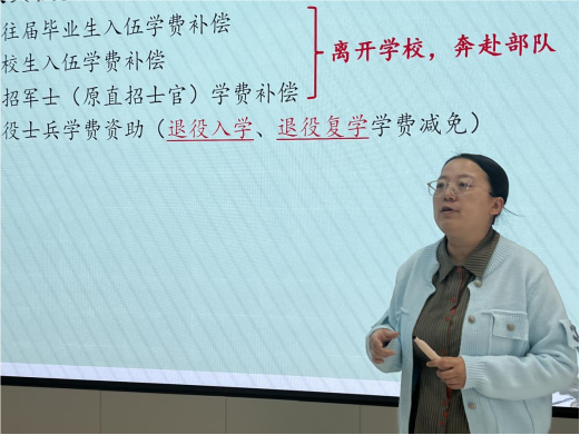 刘晶从服兵役政策入手,详细讲解了国家关于服兵役的各项资助政策,包括学费补偿、国家助学贷款代偿、学业保留与复学优惠等内容。她强调,服兵役不仅是每位适龄青年的义务,更是锻炼个人意志、提升综合素质的重要途径。通过政策的解读,辅导员们对服兵役的资助政策有了更深入的了解,这将有助于他们在日常工作中更好地指导学生,鼓励学生积极响应国家号召,投身国防事业。