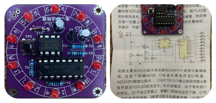信息学院电科221班臧婧棋的作品《电子幸运转盘套件制作》生动记录了她化身“电路创客”的精彩瞬间——在电子实训教室里,她专注地操控着镊子轻夹电阻,电烙铁精准点锡成珠,让NE555脉冲发生器与CD4017计数器在指尖默契“起舞”。作品说明中,她写道:“当最后一枚焊点闪烁光芒的那一刻,我感受到脉冲频率与呼吸的共鸣,更深刻领悟到电子元件协同运作背后‘毫厘必究’的工匠精神,也收获了将设计图纸转化为成品的惊喜与快乐。”