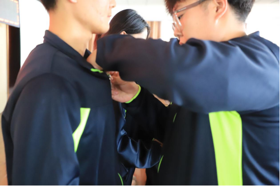 仪式第三项,老团员代表为新团员颁发团员证并佩戴团徽。团徽,代表共青团的徽章,是共青团员肩负重任的标志。”新团员们小心翼翼地接过团徽,将其佩戴在左胸前。提醒着他们时刻牢记自己的团员身份,在日常学习、生活中带头垂范立标杆,发挥共青团员的先锋模范作用。这代表着他们已经正式承担起作为一名共青团员的使命。