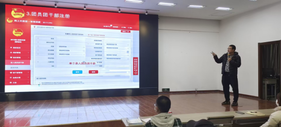 首先由机电工程系团总支书记于海龙为2022级团支书讲解《智慧团建系统的应用》。他提到作为团支书要熟练的使用有关于智慧团建的各方面内容,从系统注册,到管理员注册,信息之中不能有任何差错,并且在日常工作中要做好团日活动的录入,做到及时准确。