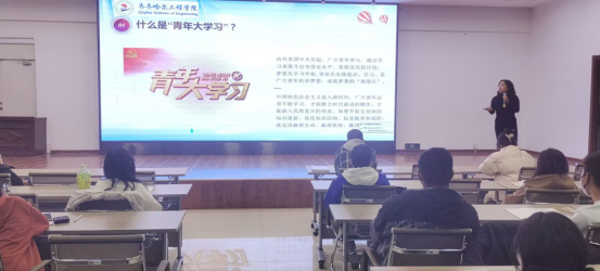 信息工程系团总支书记刘阳老师为团干部带来《青年大学习网上主题团课》的相关学习。她强调青年大学习是由共青团中央发起的,通过学习来提升大学生自身理论水平、思维层次的行动,并向团干部讲述在学习过程中的具体操作流程。