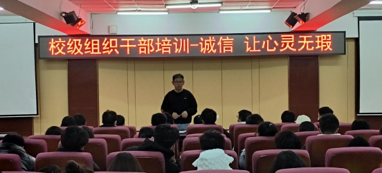 2022年12月1日17:00,在图书馆501校团委王睿老师为校级学生组织进行一次关于《诚信,让心灵无暇》为主题的干部培训,本次培训校团委、校学生会,校社团联合会,学生社区服务中心主体成员共200余人参加。