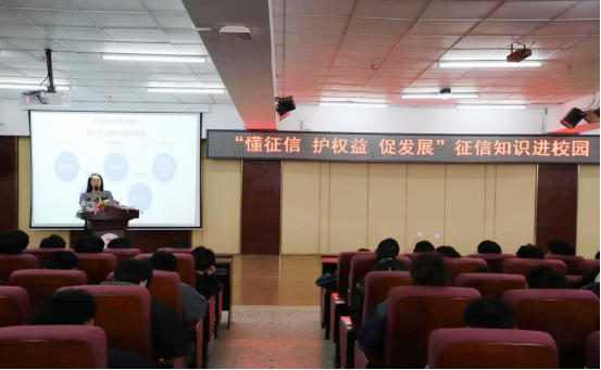 为深入开展“诚信进校园”宣传活动,促进诚信宣传教育进一步贴近在校青年,强化校园守信意识,正确引导青年学子树立正确的人生观、价值观。3月22日下午13时30分,校团委在图书馆501报告厅开展“懂征信 护权益 促发展”征信知识讲座。本次讲座邀请到中国人民银行齐齐哈尔市中心征信管理科王薇进行主讲,共有300余名学生参加此次讲座。