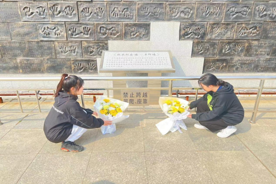 “思念莫让灰尘扰,一束黄花献伟人”。伴随着庄严肃穆的献花曲,出席活动的团员代表缓步来到《抗战纪念墙——手印墙》前,献上手中的鲜花,学生们用自己的手轻轻抚摸着“抗战墙”上革命英雄的“手印”,用自己年轻的心谛听历史深处革命英烈的伟岸呐喊,使自己的心灵得到净化和教育。