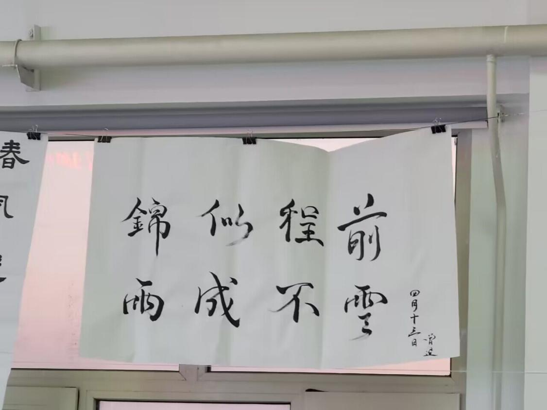 活动以现场书写的方式让同学们亲自领略中国的传统文化。书写的形式有软笔书写和硬笔书写两种。同学们可根据自己的兴趣与特长自行选择。在活动现场,同学们秀丽疏朗、倚侧秀逸的书法作品不断地一一呈现,无一不展示着汉字的深厚底蕴。同时,也透露出同学们对书法文化的热情与热爱。“前程似锦,云不成雨”墙壁上挂着同学们已经完成的书法作品与萦绕满室的悠韵墨香让活动现场的书法文化氛围愈加浓厚。书写环节结束后投票选出获奖人员,大家合影留念,活动圆满结束。