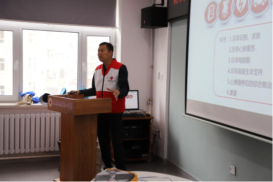 齐齐哈尔市红十字会王明老师给学生进行培训。他用生动的理论讲解、通俗易懂的教学互动等方式,来教导同学们学习如何判断病人是否需要进行心肺复苏。并且讲解了人工呼吸、心肺复苏等较为常用的理论知识、以及AED的使用方法和注意事项。并针对救护步骤、救护方法等展开详细讲解,课堂上学习氛围非常生动,知识点与真实案例恰到好处的结合,充分激发了大家对应急救护知识的浓厚兴趣。