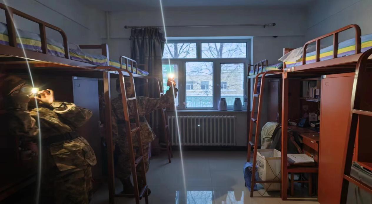 伴随漫天雪花飞舞和副团长岳鑫的一声“比赛开始”,此次大赛正式拉开帷幕。各区域评定人员分工明确,以最快的速度进入各参赛教官所在公寓。轻声的敲门,礼貌的问候,一间间窗明几净的寝室便映入眼帘。工作人员用相机记录内务情况,并注明标记,为评比提供实例素材,用真实真据确保了比赛的公平公正。