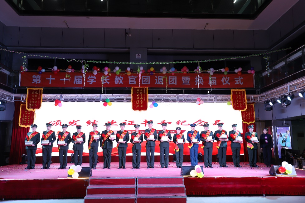 时光只解催人老,第十一届学长教官也迎来了自己的退团仪式。在观看往届退团教官录制的祝福视频后,退团教官们分享了自己在这段特殊旅程中的感悟和成长,传递着对他们的未来期许。随后,退团教官分别发言,他们表达了对学长教官团这个大家庭的不舍,在学长教官团成长的三年里他们得到的不仅仅是体魄上的强健,更有来自“亮剑”精神的淬炼与磨砺。