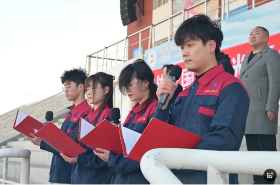 机电工程系学生代表关键铭、杨文雅、王秋月、顾祥缤等四名学生朗诵《以评促建,聚力向未来》,号召全体学生树立远大理想,培养高尚品德,勇于实践创新,呼吁同学们从自身做起,端正学习态度,加强自身修养,遵守规章制度,以实际行动迎接审核评估、促进个人成长、为学校发展贡献力量。