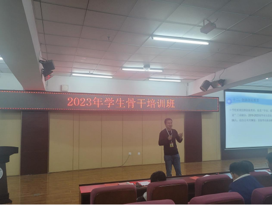 2023年10月23日晚17:00,在图书馆501开展了2023年学生骨干培训第二讲,邀请党委宣传部尹剑飞老师为同学做《我校九园区解读与见闻》的主题培训。 尹剑飞老师向同学们指出学校是立德树人的主要场所。校园文化,作为一...